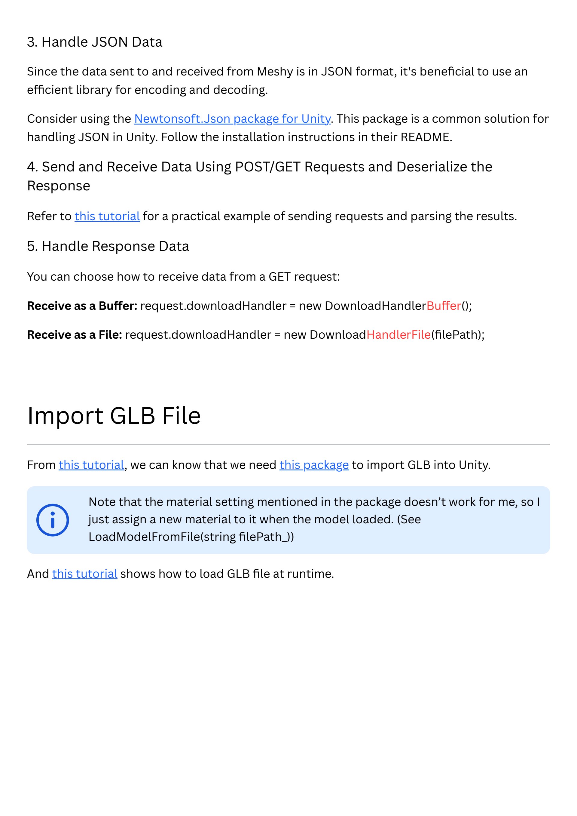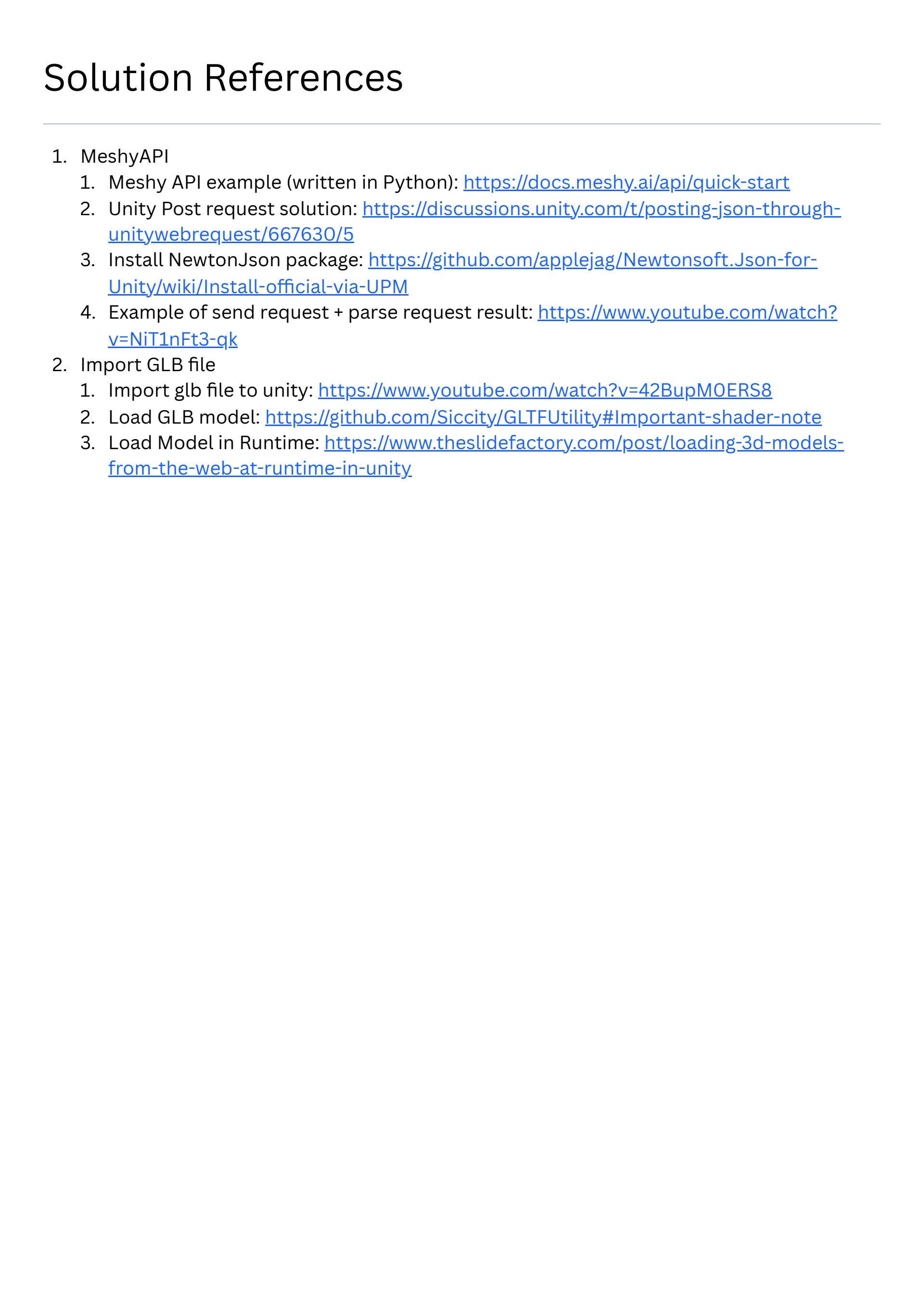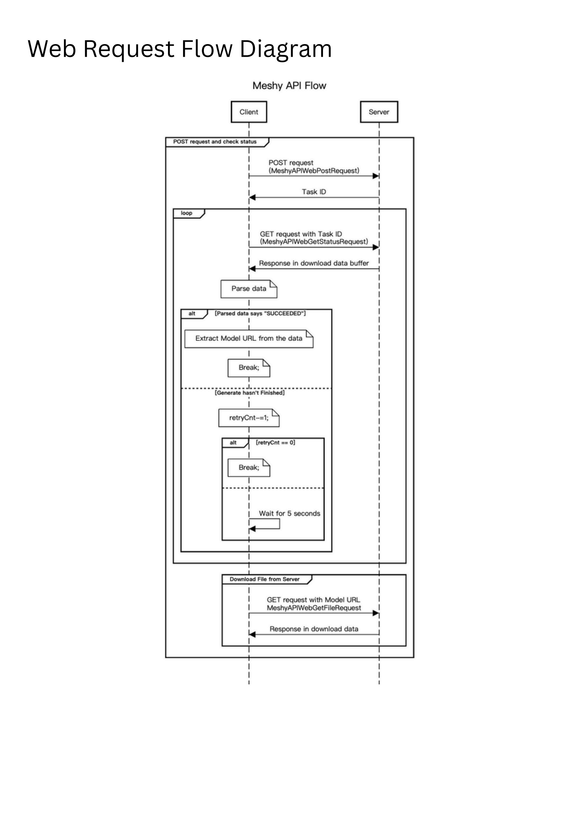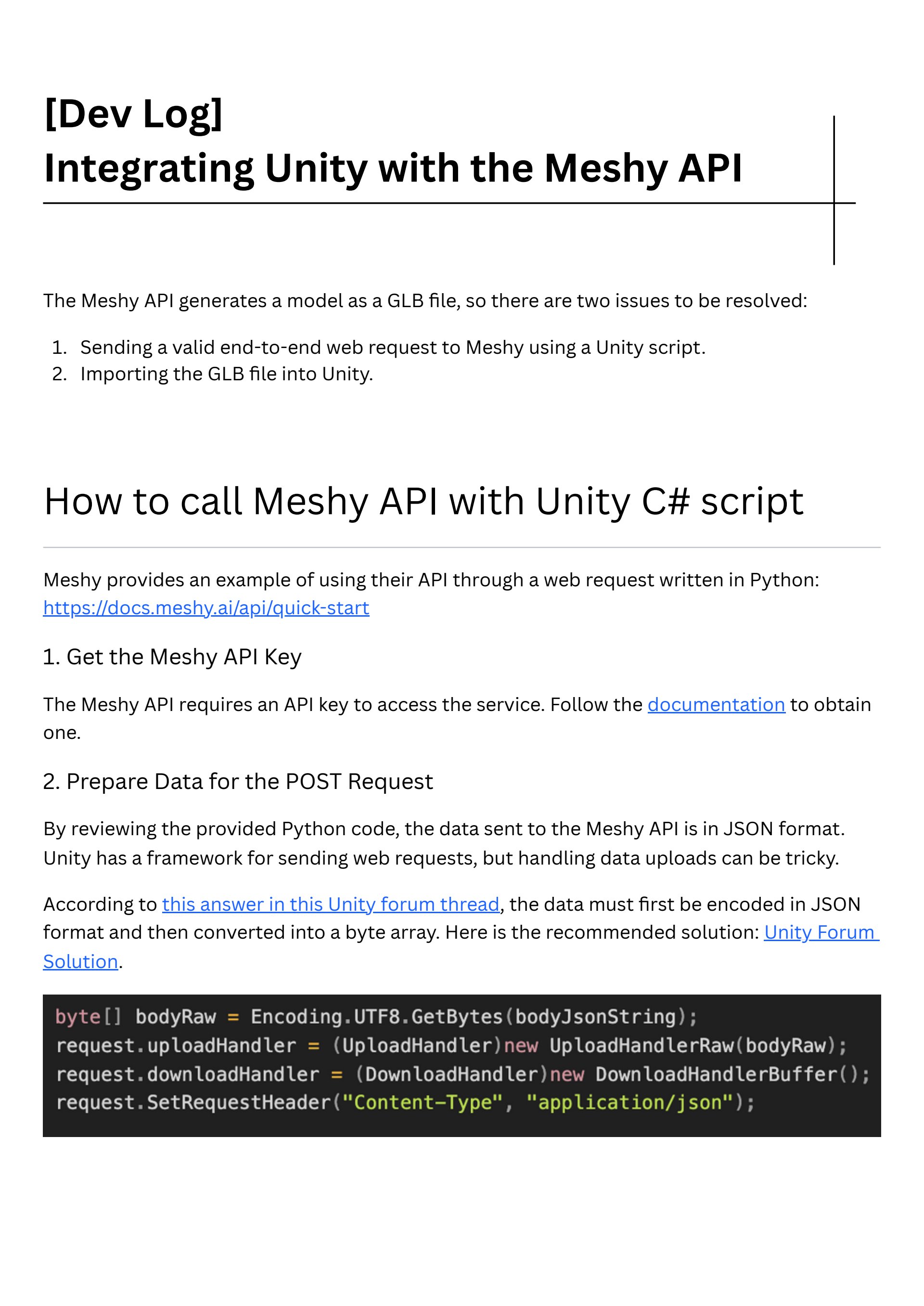 This project demonstrates the integration of the Meshy API with Unity to generate 3D models using input from Unity’s UI. While Meshy provides an example implementation in Python, this project offers a unique C# implementation, filling a gap not currently addressed by available online resources.